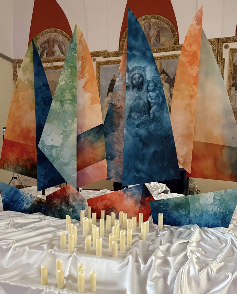 Sfondo dell’installazione artistica Il Mare e la Fede è un’opera, ideata da Giuseppe Ottaiano, che raffigura barche con le vele spiegate, simbolo della navigazione della mente che non smette mai di pensare, con un richiamo voluto all’allegoria dantesca dell’ingegno umano descritto come una barchetta.
