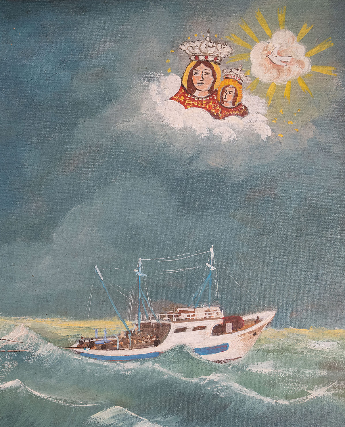 Nel mare, che diviene anche simbolo dei pericoli e dei naufragi dell’esistenza, i naviganti invocano spesso Maria, la Stella sicura che guida in porto. La Madonna dell’Arco, una delle iconografie più note e suggestive di Maria in Campania, è destinataria di numerosi ex voto per Grazia Ricevuta da gente di mare, offerte che aiutano a comprendere il motivo della grande diffusione della devozione mariana in tutto il mondo cristiano. Maria, Stella del mare, nei pericoli che occorrono durante la navigazione o metaforicamente nelle difficoltà della vita, offre e indica a tutti una direzione ben precisa, quel porto sospirato della Pace che ogni uomo sulla terra ricerca. Attraverso la Madonna dell’Arco il legame fra l’Uomo, il Mare e la Fede si fa ancora più stretto e riconoscibile: la Mostra Il Mare e la Fede si completa con una selezione di ex voto, velieri, corde, e tavolette raffiguranti lo scampato pericolo in mare.